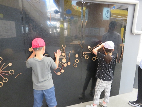 【写真上】木の枝や切り株で形を作って遊んでいるところ