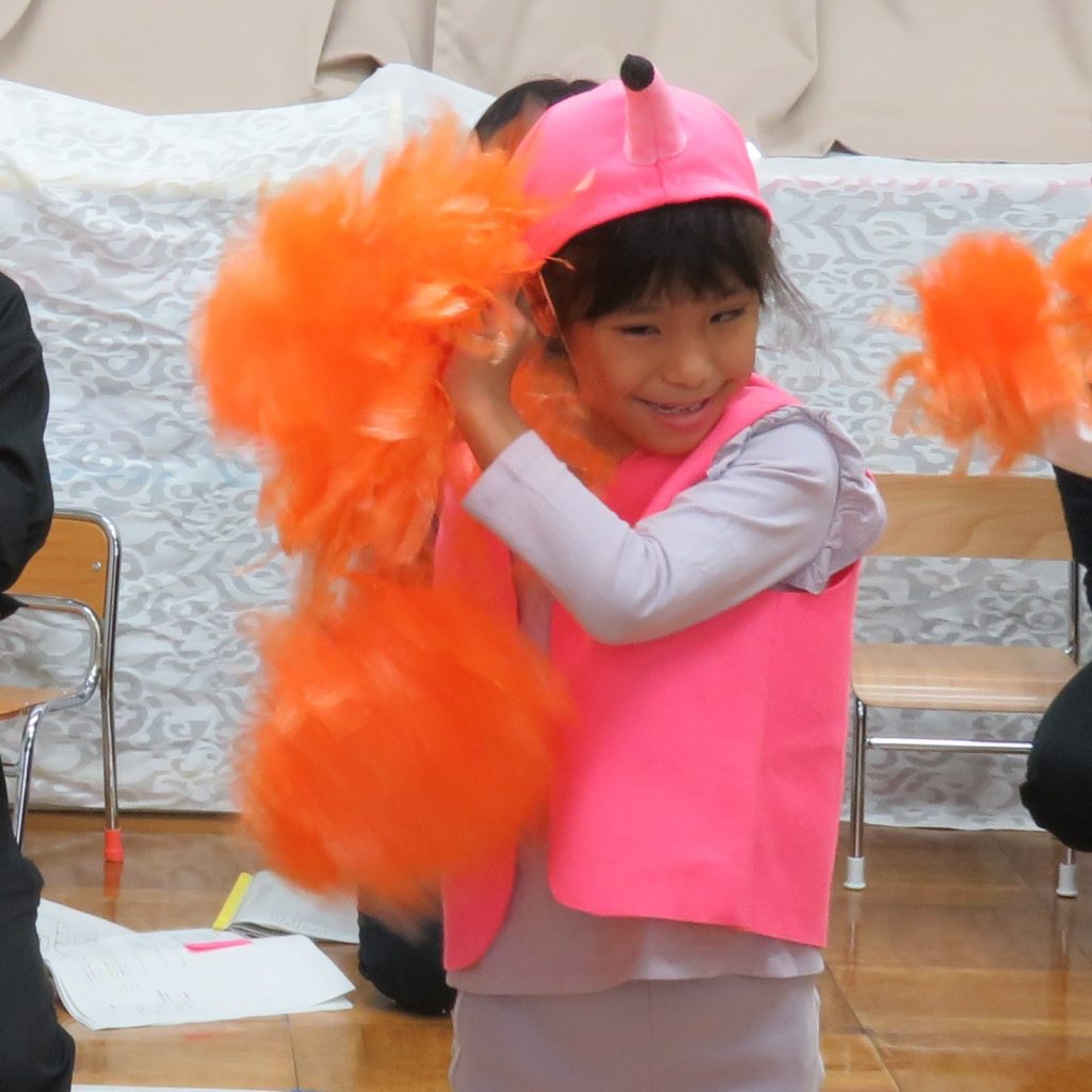 幼稚部は教室で「ぞうさんのさんぽ」の劇を発表しました。物語は、ぞうさん、きりんさん、ふらみんごさん、ぱんださん、かえるさんが、一緒にお散歩に出かけるところから始まります。お散歩の途中で見つけたキーボードやタンブリンで演奏したり、平均台を渡ったり、マットをでんぐり返しをしたり、ボールをぶつけて岩をどけたりしながら楽しくお散歩をしました。練習の成果を発揮し、笑顔があふれる素敵な劇になりました。