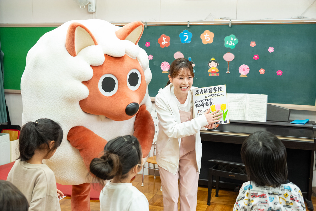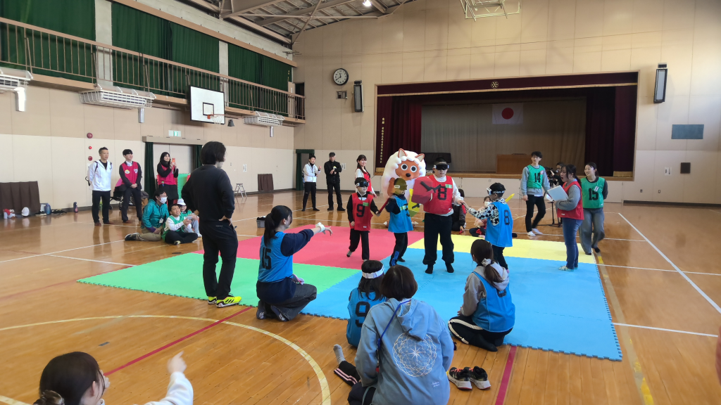 2月18日(水)午前、メ~テレ、世界ゆるスポーツ協会、柳城大学と本校小学部児童で、ゆるスポーツを楽しむ催しが行われました。この催しは、メ~テレが企画し、柳城大学の学生が視覚障害児も楽しめるスポーツを考えてくれました。本校とゆるスポーツ協会は、学生のアイデアに助言をしていく形で準備が行われました。